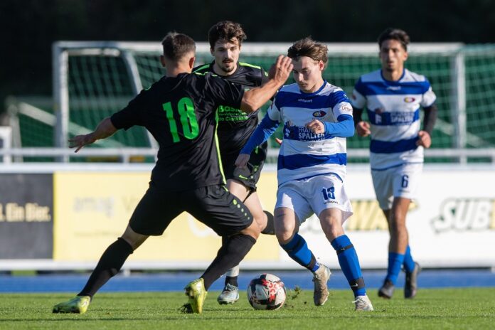 Szene vom Derby FC Schaan gegen FC Buchs. Im Bid vorne Torschütze Jonas Beck., dahinter mit der Nr. 6 Ajdari Ihsan und vonre mit der Nr. 18 der Buchser Torschütze Enis Domuzeti. Foto: Jürgen Posch