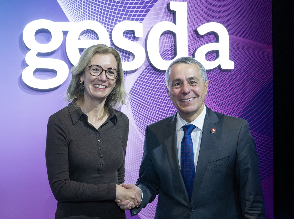 Bundesrat Ignazio Cassis (R) begrüsst Regierungsschefin-Stv. Sabine Monauni am 15. Oktober 2025 am GESDA Summit in Genf. (EDA/Pascal Lauener) IKR