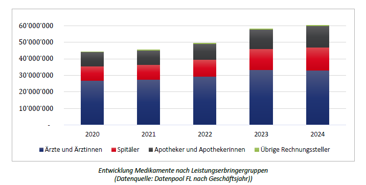 Der Bereich Ärzte macht mit knapp CHF 33 Mio. ca. 55% der gesamten Medikamentenkosten aus. Die über Ärzte verrechneten Medikamente stiegen damit über die letzten 5 Jahre um 22%. Darauf folgen Spitäler mit knapp CHF 14 Mio. (23% der Medikamente) und einer Steigerung innerhalb der letzten 5 Jahre um 60%. Den dritten grösseren Kostenblock machen die Apotheken mit rund CHF 13 Mio. (22% der Medikamente) aus. Die Apotheken verzeichneten in den vergangenen 5 Jahren prozentual ebenfalls einen markanten Anstieg von 56%.