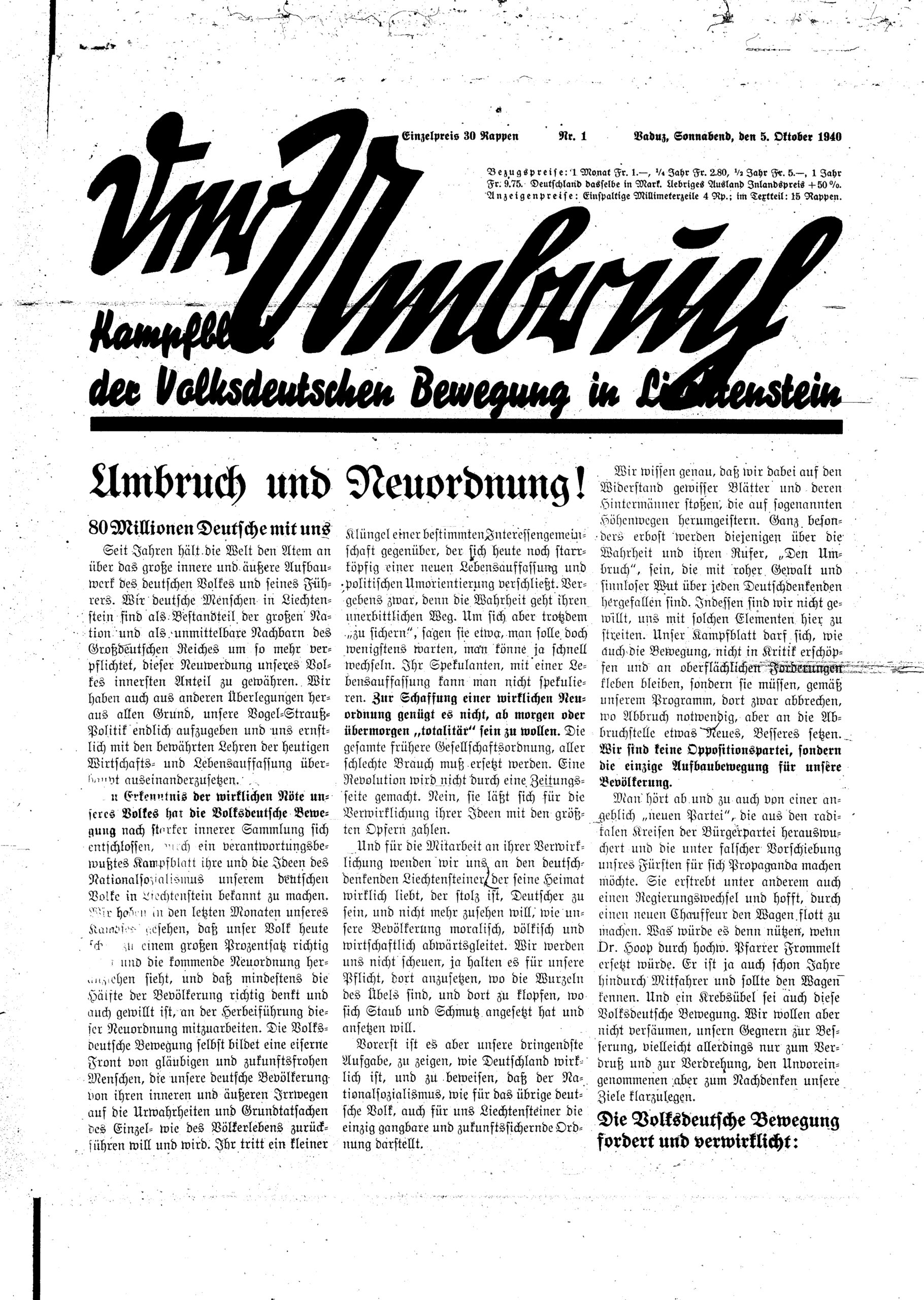 Der Volksdeutschen Bewegung war mit dem «Umbruch» eine grosse Überraschung gelungen. In zweifacher Hinsicht. Erstens hatte kaum jemand mit einer Zeitung der nazifreundlichen Bewegung gerechnet und zweitens hob sich das neue Blatt schon in der Gestaltung vom Erscheinungsbild einer traditionellen Zeitung der damaligen Zeit ab. Fette Schlagzeilen dominierten das Layout, wie der Titel «Umbruch und Neuordnung» oder «80 Millionen Deutsche mit uns». Was die Liechtensteinerinnen und Liechtensteiner bei der Erstausgabe, die nur vier Seiten umfasste, zu lesen bekamen, war keine Berichterstattung. Breit dargelegt wurde, welches Ziel sich die Volksdeutsche Bewegung gesetzt hatte, ein Bestandteil des Deutsches Reiches zu werden: «Seit Jahren hält die Welt den Atem an über das grosse innere und äussere Aufbauwerk des deutschen Volkes und seines Führers. Wir deutsche Menschen in Liechtenstein sind als Bestandteil der grossen Nation und als unmittelbare Nachbarn des Grossdeutschen Reiches um so mehr verpflichtet, dieser Neuwerdung unseres Volks innersten Anteil zu gewähren. Wir haben auch aus anderen Überlegungen heraus allen Grund, unsere Vogel-Strauss-Politik endlich aufzugeben und uns ernsthaft mit den bewährten Lehren der heutigen Wirtschafts- und Lebensauffassung überhaupt auseinanderzusetzen.»