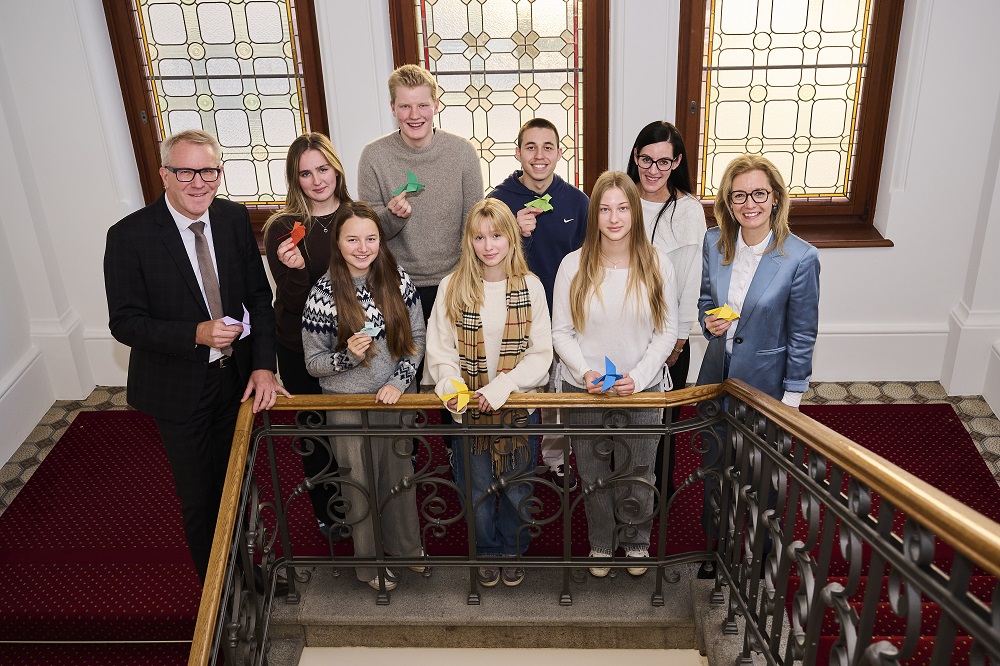 Ein besonderer Höhepunkt stellte die symbolische Übergabe der selbst gefalteten Friedenstauben am 10. November an Regierungschefin-Stellvertreterin, Sabine Monauni, und Bildungsminister, Daniel Oehry, dar. Die Schülerinnen und Schüler appellierten eindringlich an die Verantwortung der Politik, sich für den Schutz von Kindern in bewaffneten Konflikten einzusetzen. Die Regierungsmitglieder waren vom Engagement der Jugendlichen beindruckt.