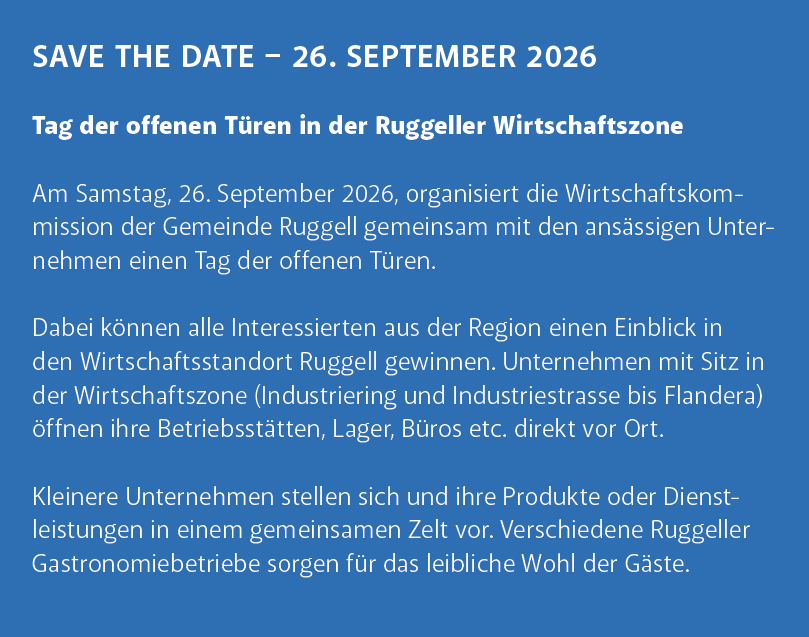 Zum Abschluss der Veranstaltung kündigte Jürgen Hasler (Vorsitzender der Wirtschaftskommission) für 2026 einen Tag der offenen Tür an. Damit soll die Vielfalt und Leistungsfähigkeit der Ruggeller Unternehmen sichtbar gemacht werden. Beim anschliessenden Apéro stand dann der gesellige Austausch im Zentrum.