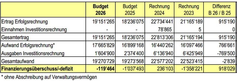 In der Erfolgsrechnung resultiert ein Verlust von CHF -1‘515’004 für das Jahr 2026. Die grössten Kostenpunkte neben dem Personalaufwand (4.76 Mio.) sind auch im kommenden Jahr wieder der bauliche Unterhalt (CHF 2.73 Mio.) sowie diverse Dienstleistungen und Honorare (CHF 2.3 Mio.), beispielsweise für Ausstellungen im Küefer-Martis-Huus, den Unterhalt der Sportplätze mit externer Beratung oder für Dienstleistungen des Ortsplanungsbüros. Vom landesweiten Finanzausgleich rechnet die Gemeindekasse mit Einnahmen von CHF 5.208 Mio. für das Jahr 2026 (Budget 2025: CHF 5.876 Mio.). Neben dem Personal- und Sachaufwand stellen auch die Beitragsleistungen einen grossen finanziellen Aufwand dar. Hierbei sind für 2026 CHF 5.61 Mio. budgetiert. Die beiden grössten Positionen sind der Lohnanteil an die Lehrpersonen der Ruggeller Gemeindeschule (CHF 1.88 Mio.) sowie die Ergänzungsleistungen an die AHV/IV und Pflegegelder (CHF 973‘000) aus.