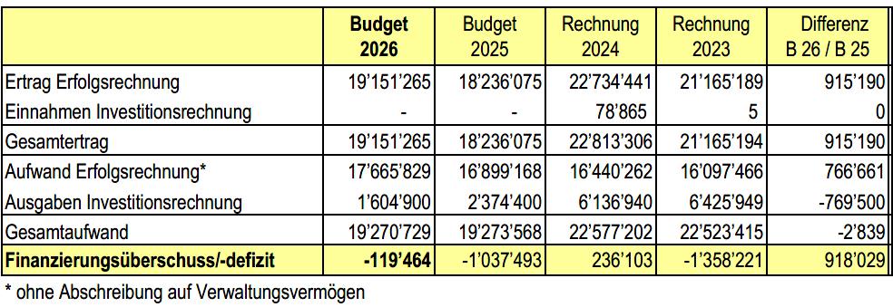 Die Gesamtrechnung weist zusammenfassend ein Finanzierungsdefizit von CHF -119‘464 auf.