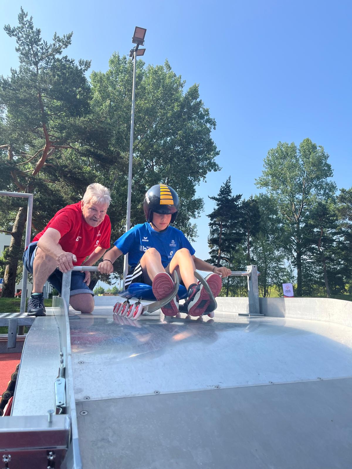 Ein jugendlicher Rodler erhält vom Technischen Leiter, Elmar Fetz, beim Olympic Day Starthilfe. Foto: Ernst Hasler