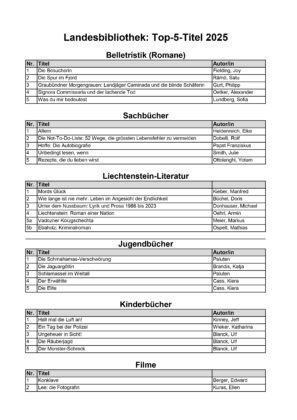 Die Liechtensteinische Landesbibliothek präsentiert die Jahres-bestenliste 2025, die spannende Einblicke in die Lesegewohnheiten ihrer Benutzerinnen und Benutzer bietet. Sie zeigt, welche Titel besonders beliebt waren. Je nach Kategorie wurden die Spitzenreiter zwischen acht und 22 Mal ausgeliehen.