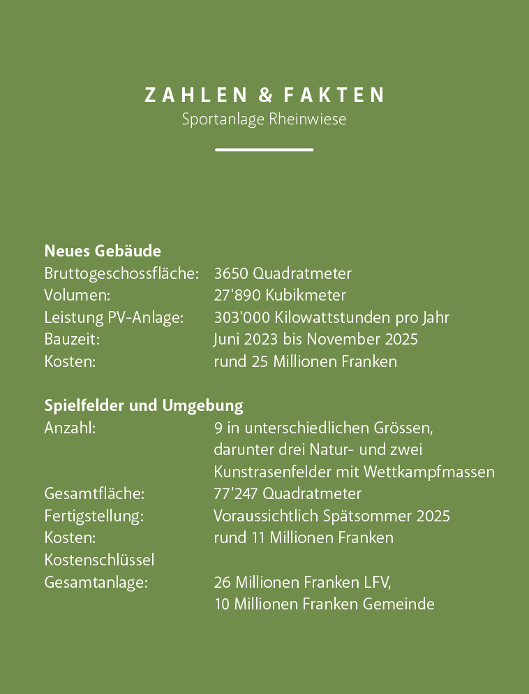 Rückblick: Am 28. Juni 2023 trafen sich auf der Schaaner Sportanlage Rheinwiese mit Gemeindevorsteher Daniel Hilti und Hugo Quaderer, dem Präsidenten des Liechtensteiner Fussballverbands (LFV), die Bauherren für ein neues, modernes und zweckmässiges Gebäude zum Spatenstich. «Ich freue mich sehr, dass wir mit diesem Projekt die Infrastruktur für die auf der Rheinwiese ansässigen Sportvereine weiter verbessern können. Darüber hinaus sehe ich die Anlage als idealen Aufenthaltsort für die Öffentlichkeit, die von den Freiflächen und den zusätzlichen Angeboten profitieren kann», sagte Vorsteher Daniel Hilti damals. Er blickte damit voraus auf das L-förmige Gebäude, welches das künftige Hauptspielfeld für internationale Fussballspiele des Frauen- und der Nachwuchs-nationalteams auf zwei Seiten umschliessen und neben Räumlichkeiten für den FC Schaan auch solche für den Leichtathletikclub und den Turnverein enthalten sollte.
