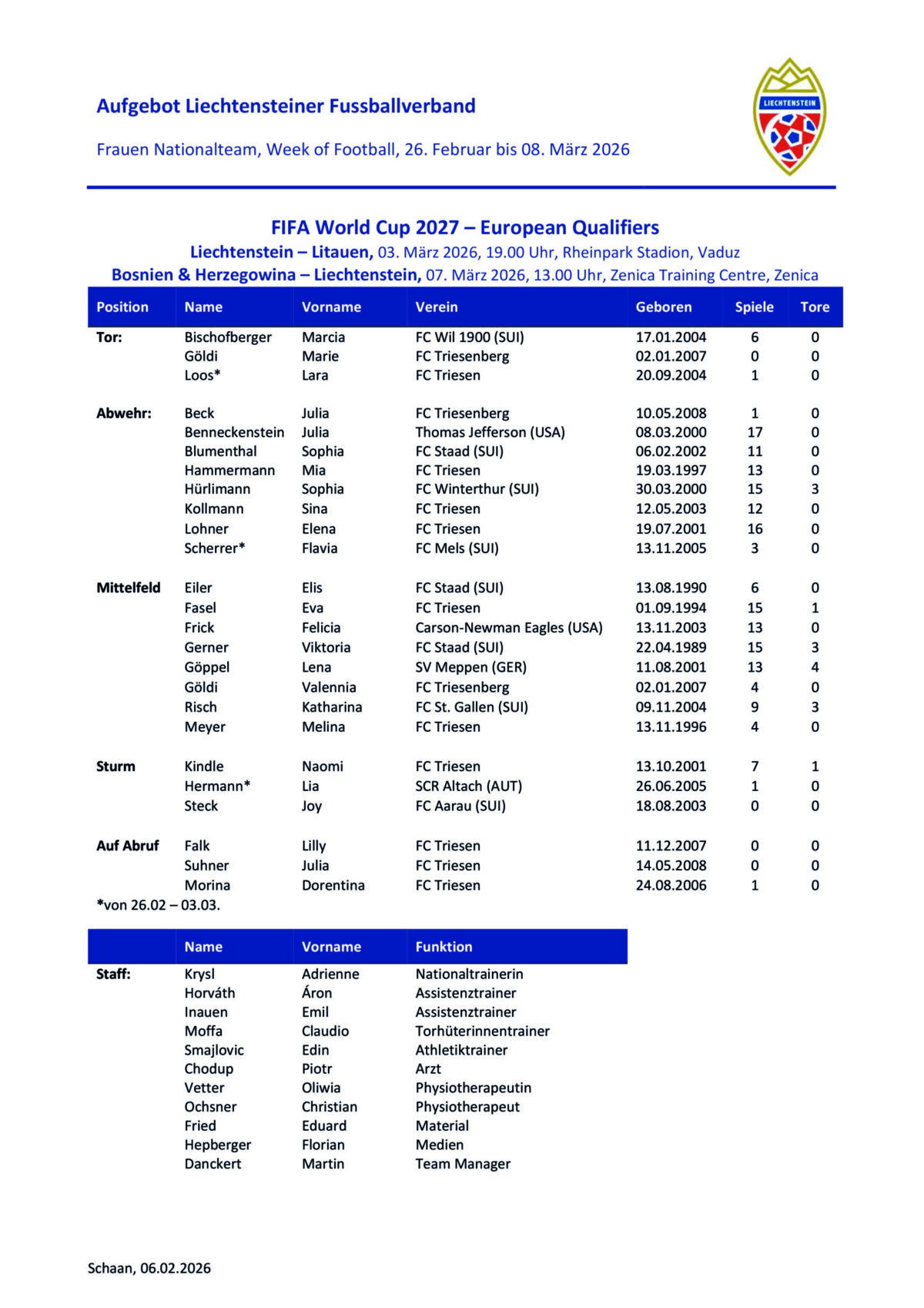 Am Dienstag, 3. März beginnt für Liechtensteins Frauen Nationalteam die zweite Pflichtspielkampagne. In der WM-Qualifikation stehen mit dem Heimspiel gegen Litauen und dem Auswärtsspiel gegen Bosnien & Herzegowina die ersten zwei Spiele auf dem Programm.