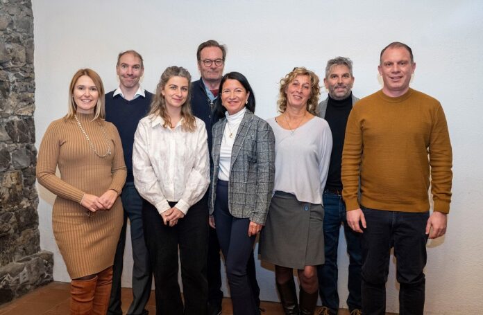 Bildlegende: Sandra Woldt (1FLTV), Gregor Meier (Landesspiegel), Alexandra Fitz (Vaduzer Medienhaus), Sven Beham (Fotograf), Carmen Dahl (Präsidentin), Eva Wohlwend (Generalsekretärin), Philipp Wyss (Vizepräsident; Südostschweiz), Andreas Krättli (AK Digital Media) Foto: Silvia Abderhalden, exclusiv