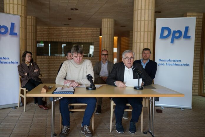 Demokraten pro Liechtenstein (DpL) haben am Montag eine Volksinitiative zur Sicherung eines effizienten Stromnetzes lanciert. Parteipräsident und Abg. Thomnas Rehak und der Abg.Erich Hasler stellten zusammen mit der Landtagasfraktion die Volksinitiative in Vaduz vor. Foto: Gregor Meier.