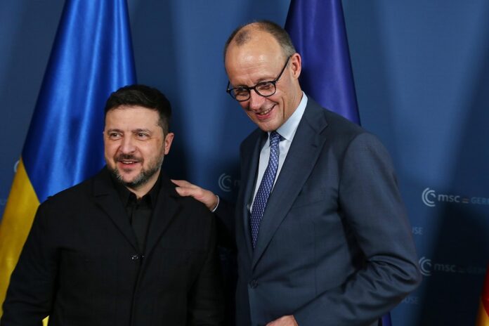 Münchner Sicherheitskonferenz 2026: Wolodymyr Selenskyj, Präsident der Ukraine, und der deutsche Bundeskanzler Friedrich Merz (CDU). Merz' klare und subtil gehaltene Eröffnungsrede sprach vielen aus dem Herzen. Foto: Picture Alliance, Frankfurt/Main