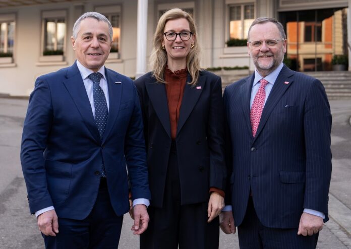 Ignazio Cassis, Bundesrat der Schweizerischen Eidgenossenschaft und amtierender Vorsitzender der OSZE, Sabine Monauni, stellvertretende Regierungschefin des Fürstentums Liechtenstein, sowie Sepp Schellhorn, Staatssekretär im Bundesministerium für europäische und internationale Angelegenheiten der Republik Österreich. (Quelle: EDA/Neal Schuler)