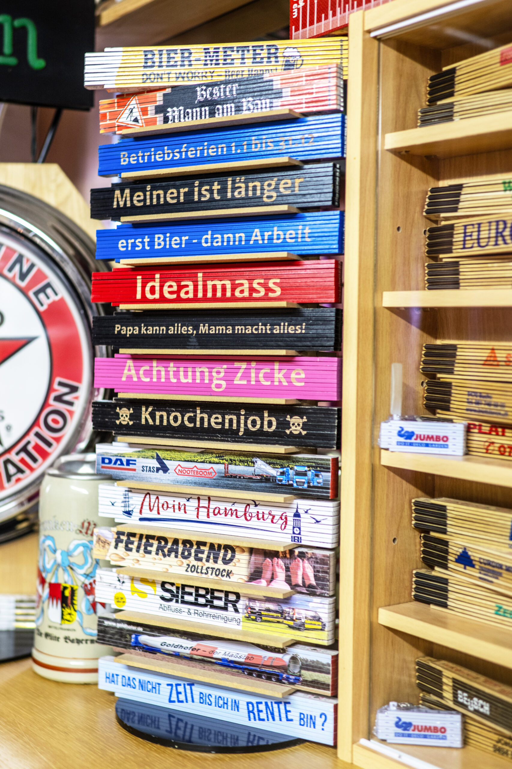 In Lothars «Meter»-Sammlung gibt es keine Duplikate und keine unbeschrifteten beziehungsweise «bebilderten» Messobjekte. Es ist wichtig und gibt der Sammlung auch den unikaten Charakter, dass die «Meter» mit Unternehmensbeschriftungen versehen sind. Amüsant sind auch die «Spass-Meter», wie Lothar Biedermann sie nennt, welche mit humorvollen Aufschriften gestaltet sind wie beispielsweise «Idealmass», «Achtung Zicke», «Papa kann alles, Mama macht alles» und viele weitere Sprüche.
