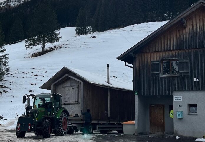 Bildunterschrift: Die Loipahötta wird vom angestammten Platz abgeschleppt.