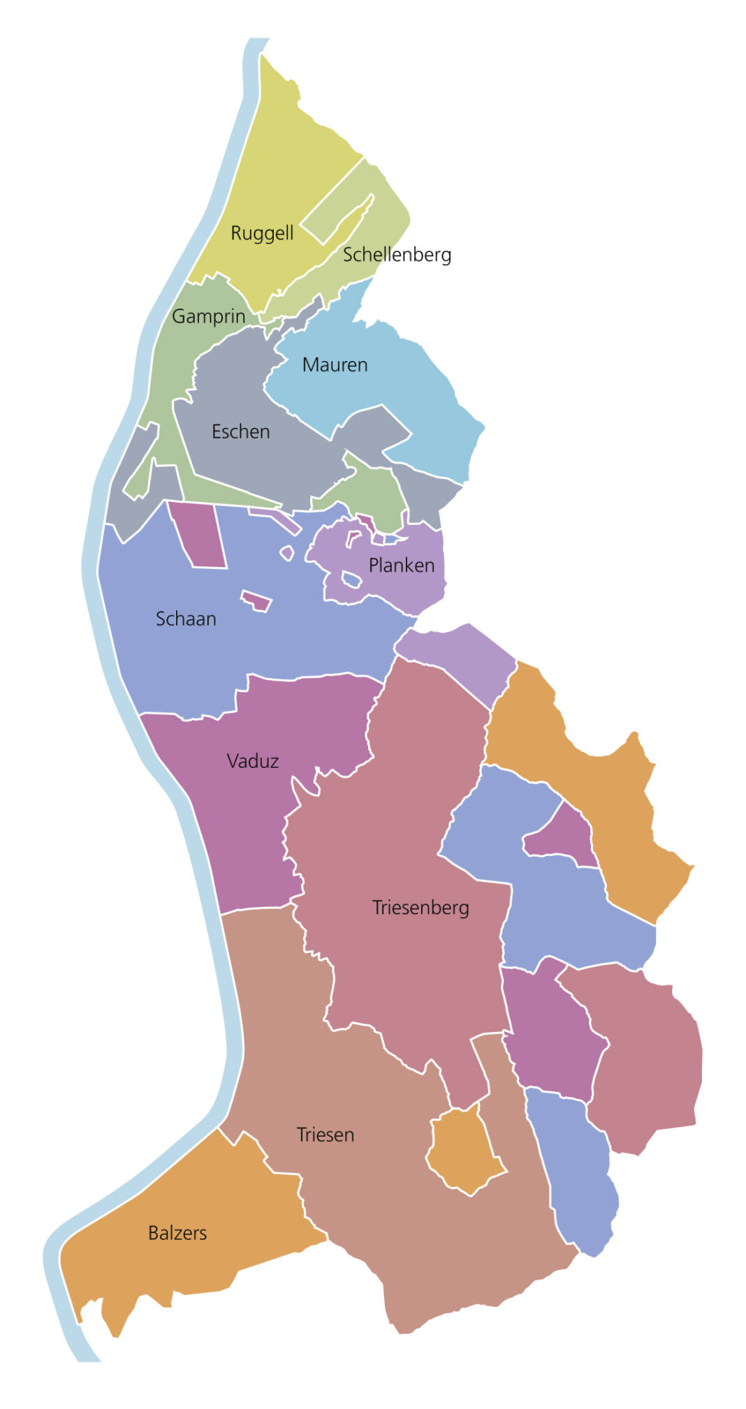 Die elf Gemeinden werden in der Verfassung namentlich aufgezählt. Grenzänderungen zwischen Gemeinden, die Schaffung neuer oder die Zusammenlegung bestehender Gemeinden benötigen einen Mehrheitsbeschluss der in den betreffenden Gemeinden wahlberechtigten Landesangehörigen. Seit der Verfassungsrevision von 2003 haben die Gemeinden auch das Recht, aus dem Staatsverband auszutreten.