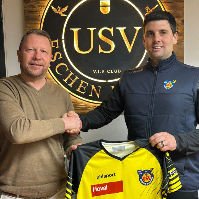 USV-Präsident Mathias Speiser (r.) mit dem neuen Trainer Patrick Winkler. Foto: USV