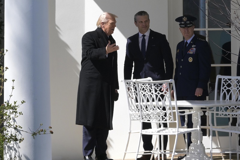 Donald Trump, Verteidigungsminister Pete Hegseth und ein hochrangiger General im Garten des Pentagons. Foto: Picture Alliance, Frankfurt/Main
