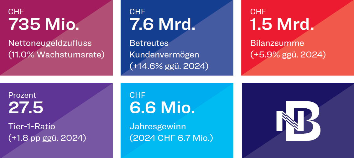 Trotz belastendem Zinsumfeld, gezielter Investitionen in Wachstum, zusätzliche Mitarbeitende und die Modernisierung der Infrastruktur blieb der Jahresgewinn mit CHF 6.6 Mio. nahezu auf Vorjahresniveau (2024: CHF 6.7 Mio.). Die Neue Bank konnte damit ihr Wachstum aus eigener Kraft und mit konstantem Ergebnis finanzieren.