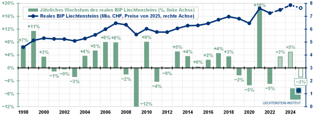 Liechtensteins Wirtschaftsleistung gemessen am realen Bruttoinlandsprodukt (BIP) war im von US-Zöllen geprägten Jahr 2025 rückläufig und konnte damit die überraschend positive Tendenz der beiden Vorjahre nicht fortsetzen. Gemäss Schätzungsmodell des Liechtenstein-Instituts beläuft sich das nominale BIP 2025 auf rund 7’641 Mio. CHF. Ausgehend vom nominalen BIP 2024 der vom Amt für Statistik veröffentlichten Schätzrechnung ergibt sich im Schätzungsmodell für 2025 ein nominales BIP-Wachstum von ungefähr −3%. Wegen der tiefen Inflation liegt die reale BIP-Wachstumsrate 2025 nur leicht tiefer und gerundet ebenfalls bei −3%.