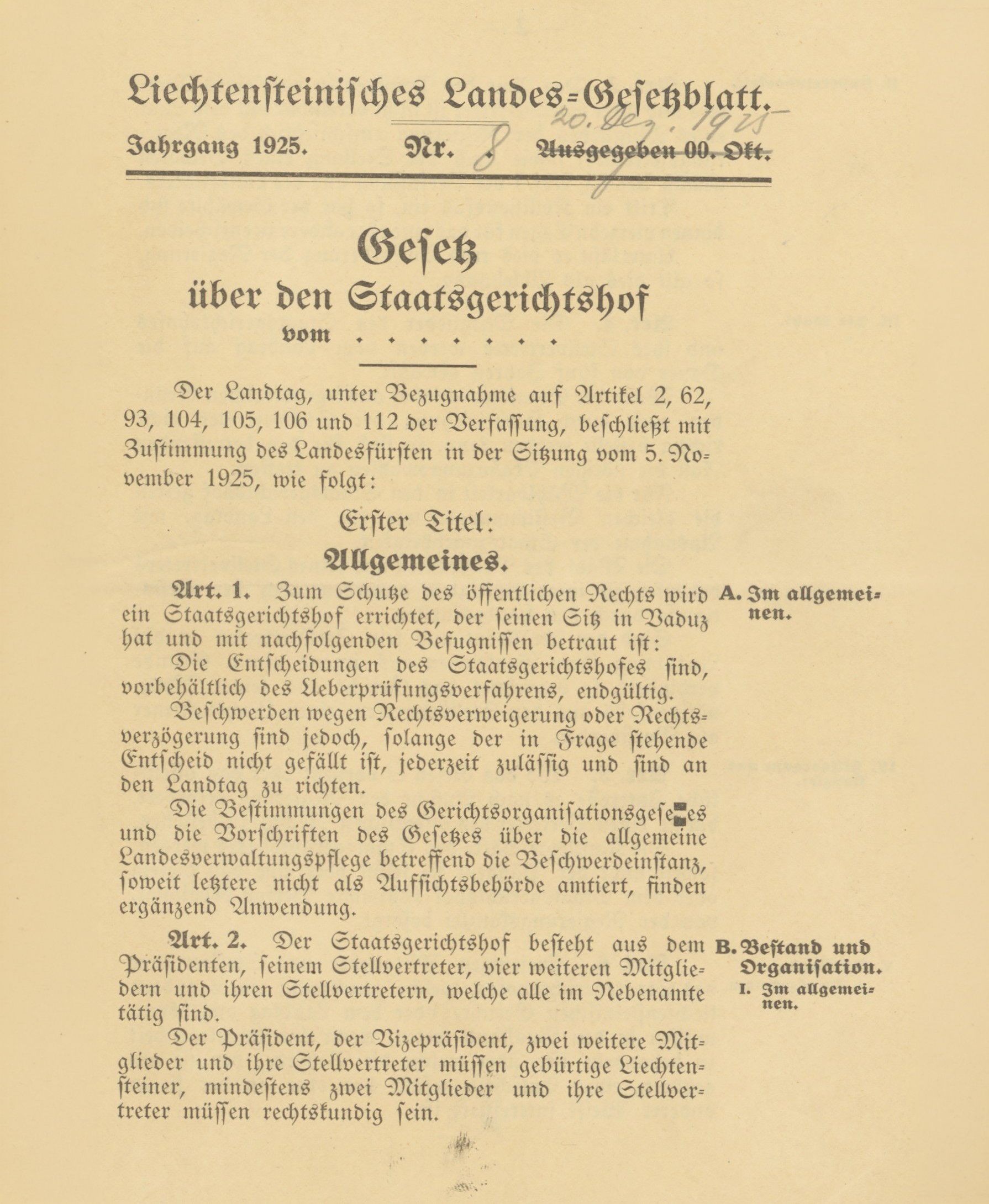 Seit 1926 nimmt der Staatsgerichtshof Individualbeschwerden entgegen und überprüft Gesetzes- und Verordnungsbestimmungen auf ihre Übereinstimmung mit der Verfassung. Der Staatsgerichtshof gehört zu den älteren Verfassungsgerichten Europas. Zudem verfügt er über umfangreiche Kompetenzen.