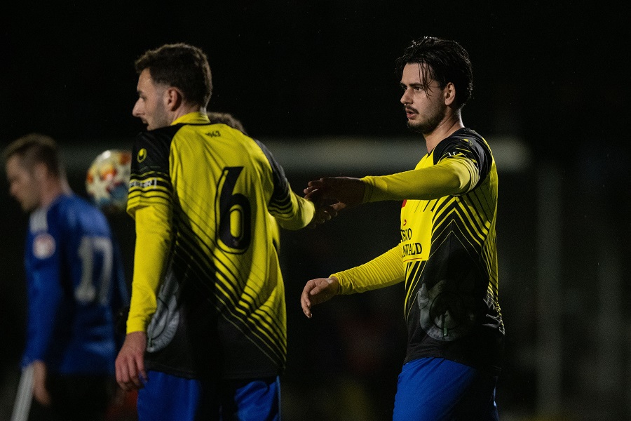BILD 1 oben:Freude bei den USV-Torschützen Sevanovic und Gjorgijevski beim 11:1-Sieg im Cup-Halfinale in Triesen. Foto: Jürgen Posch