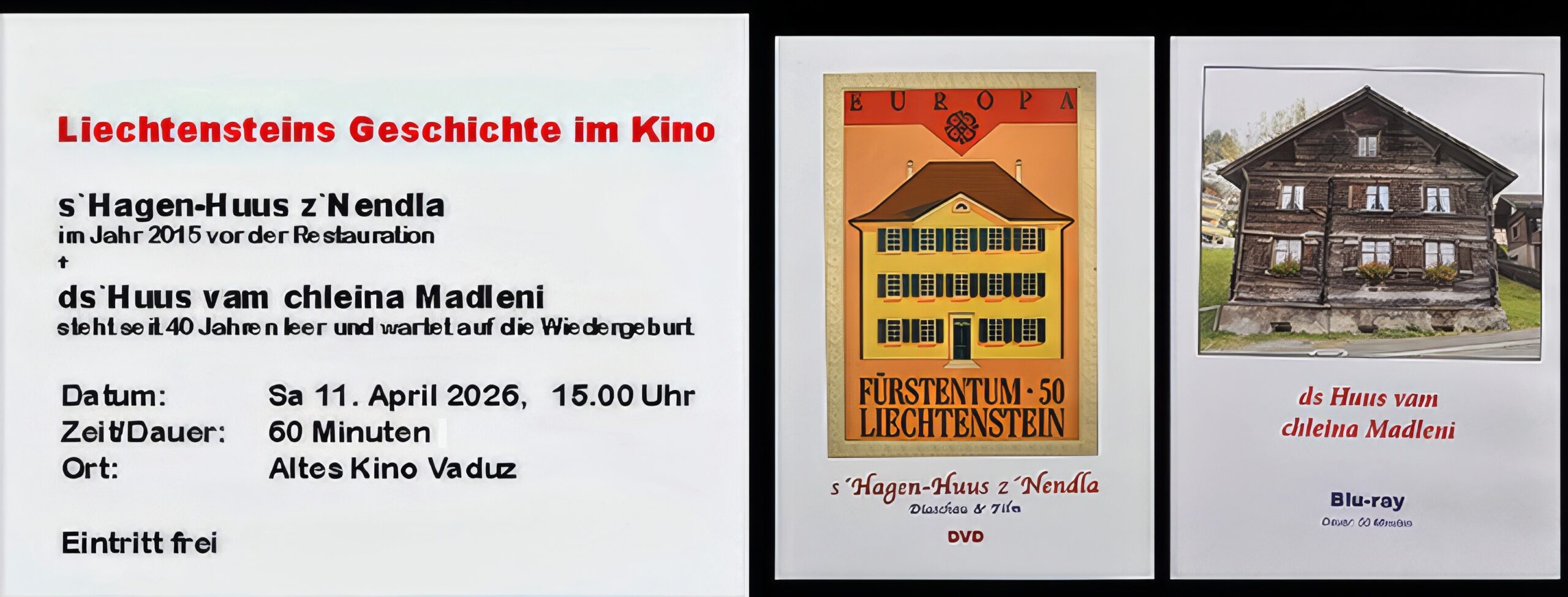 Der Triesenberger Filmemacher und Fotograf Klaus Schädler zeigt am Samstag, 11. April 2026 um 15 Uhr im Alten Kino Vaduz eine weitere Episode Liechtensteiner Geschichte. Er stellt uns das Madleni-Huus in Triesenberg und das Hagen-Huus in Nendeln anhand von herrlichem Aufnahmen näher vor. Dauer der Filmvorführung: 60 Minuten. Eintritt frei.