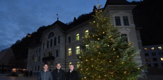 Weihnachtsbaum der Gemeinde Planken vor dem Regierungsgebäude