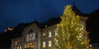 Weihnachtsbaum der Gemeinde Eschen vor dem Regierungsgebäude