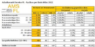 263 Arbeitslose Ende März 2022 in Liechtenstein