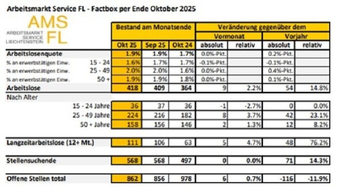Vaduz (ots) - Beim Arbeitsmarkt Service Liechtenstein (AMS FL) waren Ende Oktober 418 Personen arbeitslos gemeldet. Die Arbeitslosenquote blieb im Oktober mit 1,9 %...