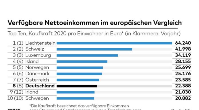 Die Einkommen, sprich Durchschnittsgehälter in Europa sind verschieden. An der Spitze steht mit Abstand das Fürstentum Liechtenstein, vor der Schweiz...
