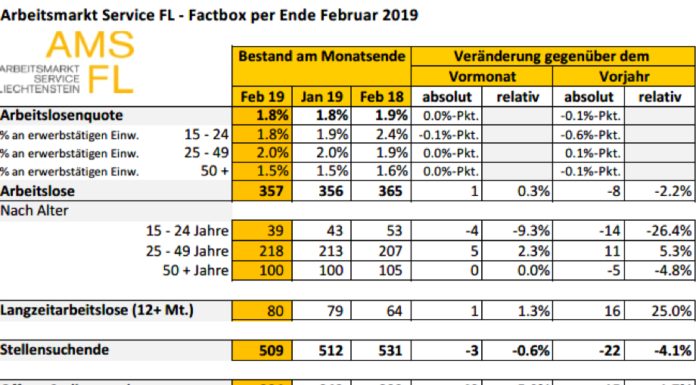 Gemäss den Erhebungen des Arbeitsmarkt Service Liechtenstein (AMS FL) waren Ende Februar 357 Arbeitslose beim AMS FL gemeldet, 1 Person mehr als im Vormonat....
