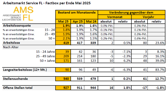 Vaduz (ots) - Beim Arbeitsmarkt Service Liechtenstein (AMS FL) waren Ende Mai 419 Personen arbeitslos gemeldet. Die Arbeitslosenquote bleibt im Mai mit 1,9 %...