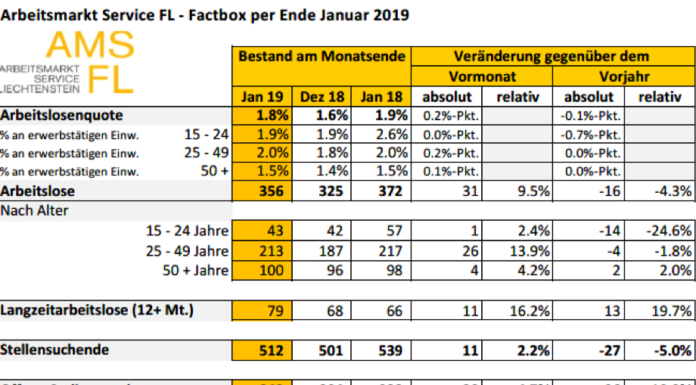 Gemäss den Erhebungen des Arbeitsmarkt Service Liechtenstein (AMS FL) waren Ende Januar 356 Arbeitslose beim AMS FL gemeldet, 31 Personen mehr als im Vormonat....