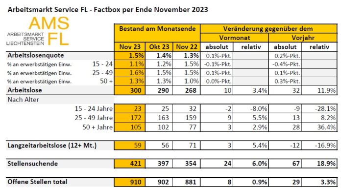 Vaduz (ots) - Beim Arbeitsmarkt Service Liechtenstein (AMS FL) waren Ende November 300 Arbeitslose gemeldet, 10 Personen mehr...