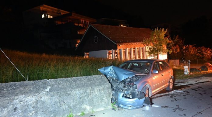 Buchs, 10.6.2023 - Am Samstag (10.06.2023), kurz vor 1:10 Uhr, ist ein 30-jähriger Mann mit seinem Auto auf der Altendorferstrasse gegen eine Mauer geprallt....