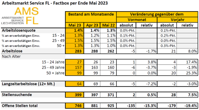 Vaduz (ots) - Beim Arbeitsmarkt Service Liechtenstein (AMS FL) waren Ende Mai 283 Arbeitslose gemeldet, 5 Personen weniger als im...