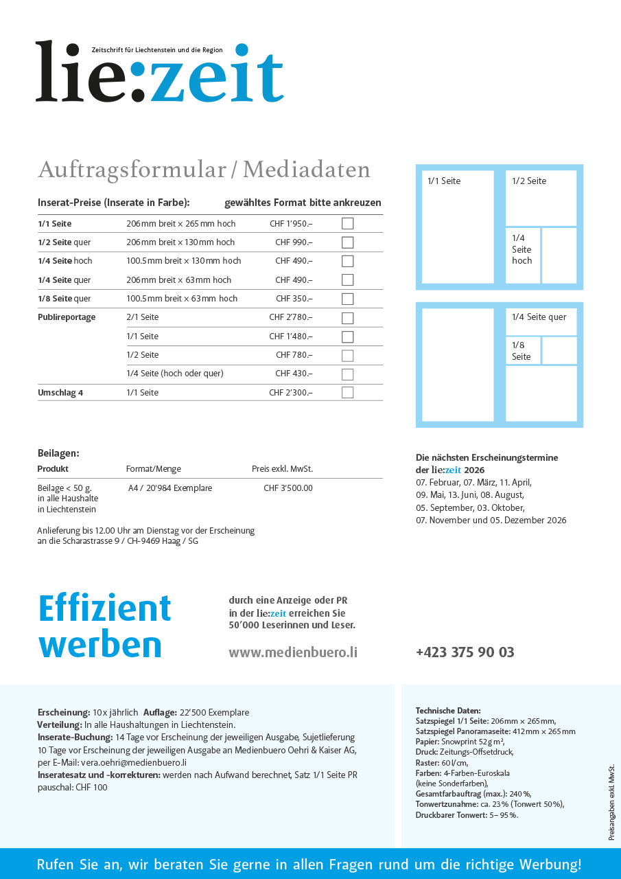 Sie möchten in der lie:zeit inserieren oder mit einer Publireportage auf Ihr Unternehmen oder Produkt aufmerksam machen?