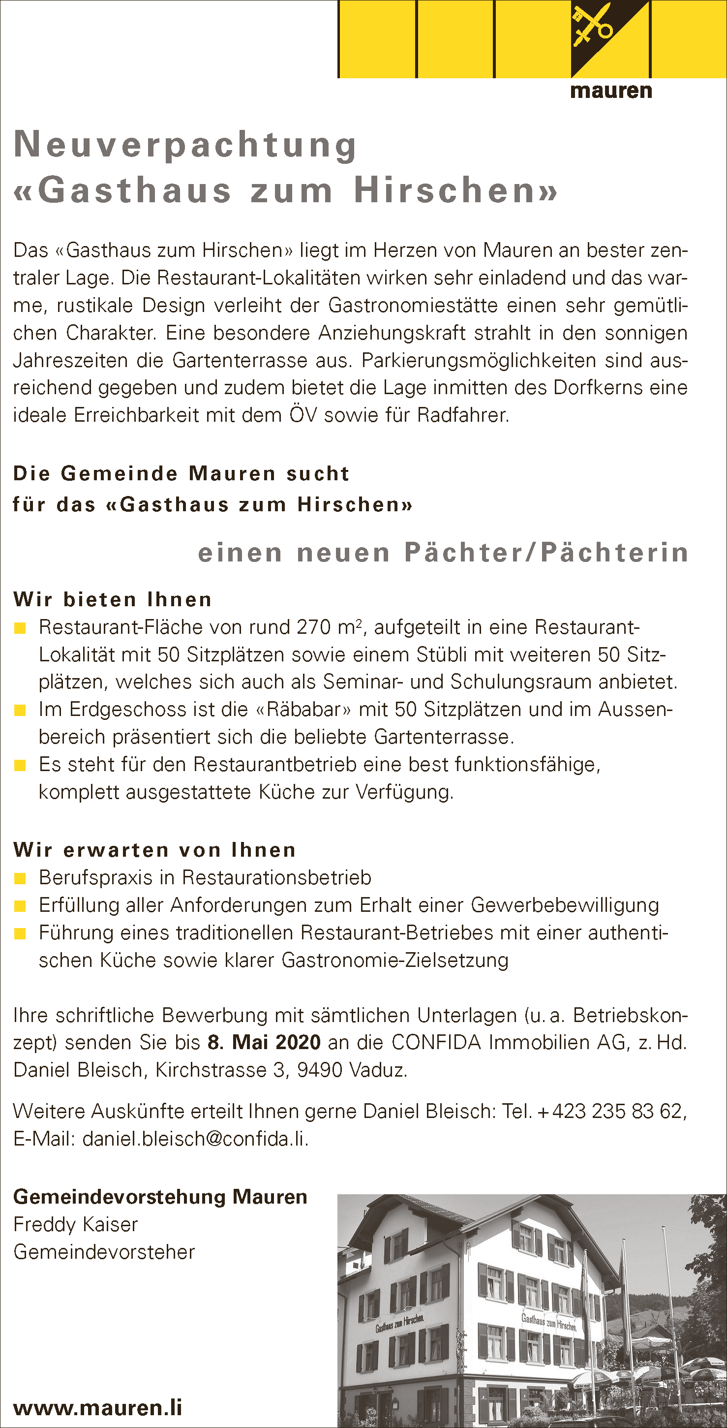 Start Neuverpachtung «Gasthaus zum Hirschen»